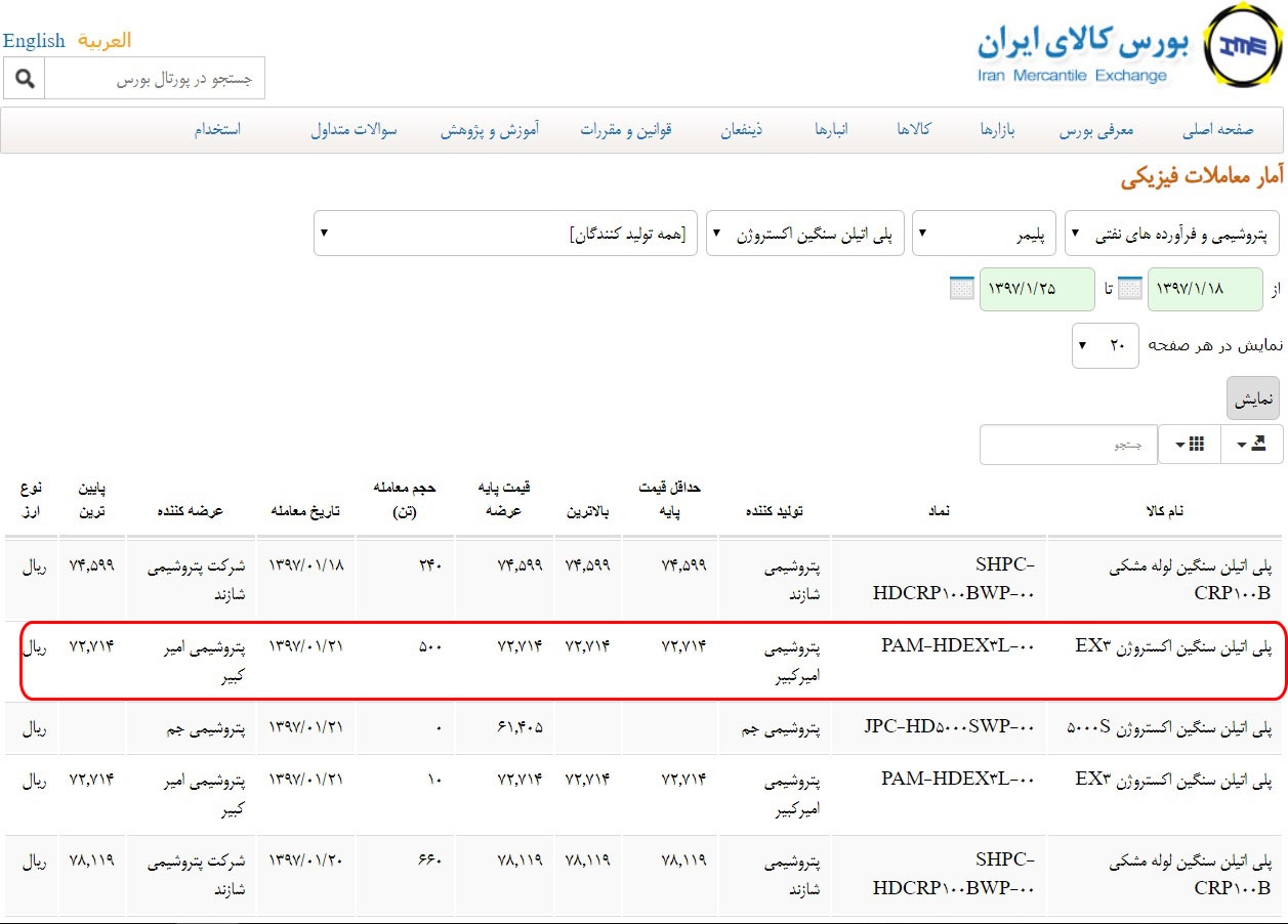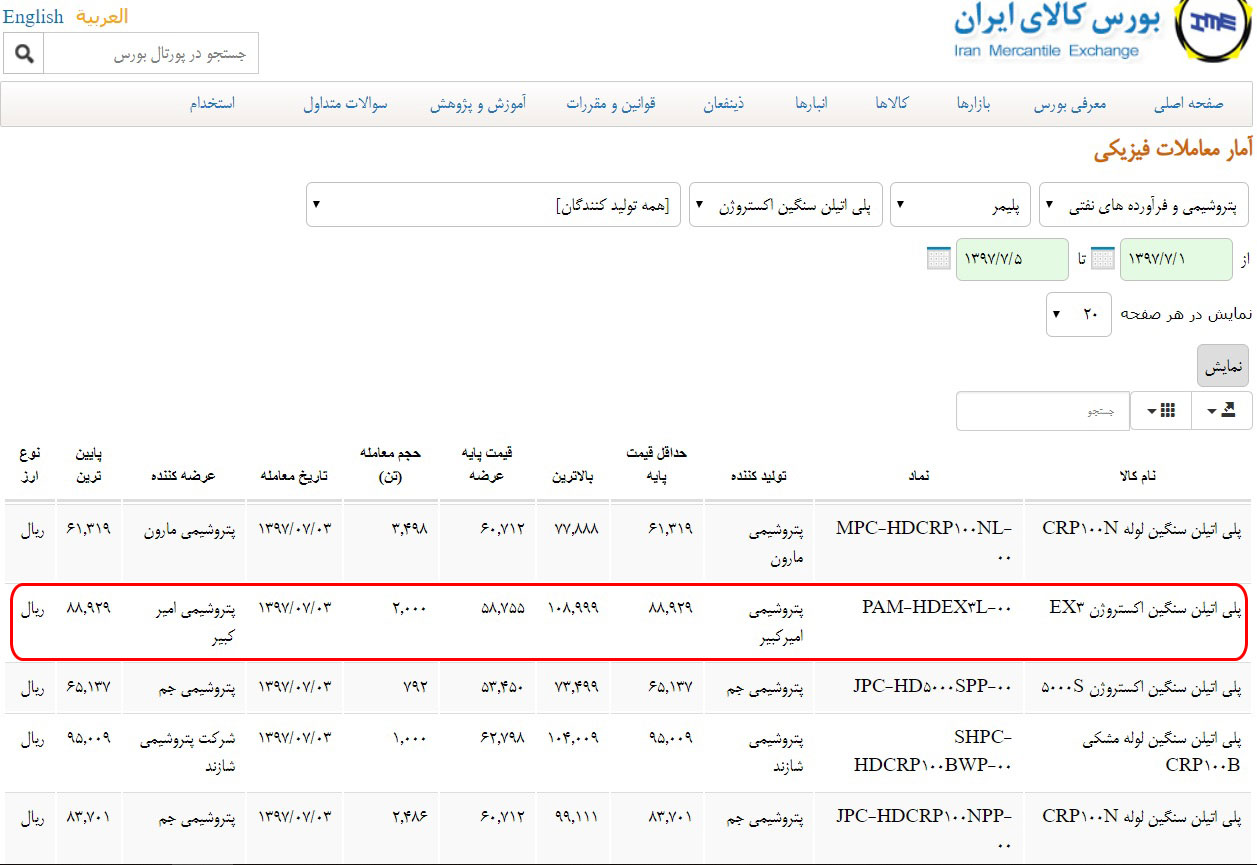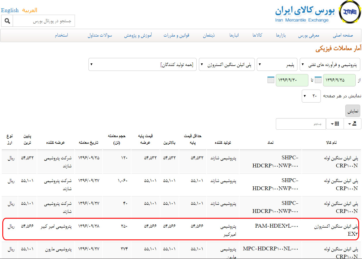 تاریخ پیشنهاد پیمانکار ۱۳۹۶/۰۹/۲۵ بوده و بنابراین طبق توضیحات در سایت بورس کالا مقدار پایین ترین قیمت پلی اتیلن سنگین اکستروژن را در اولین روز عرضه از تاریخ مذکور را بدست می آوریم