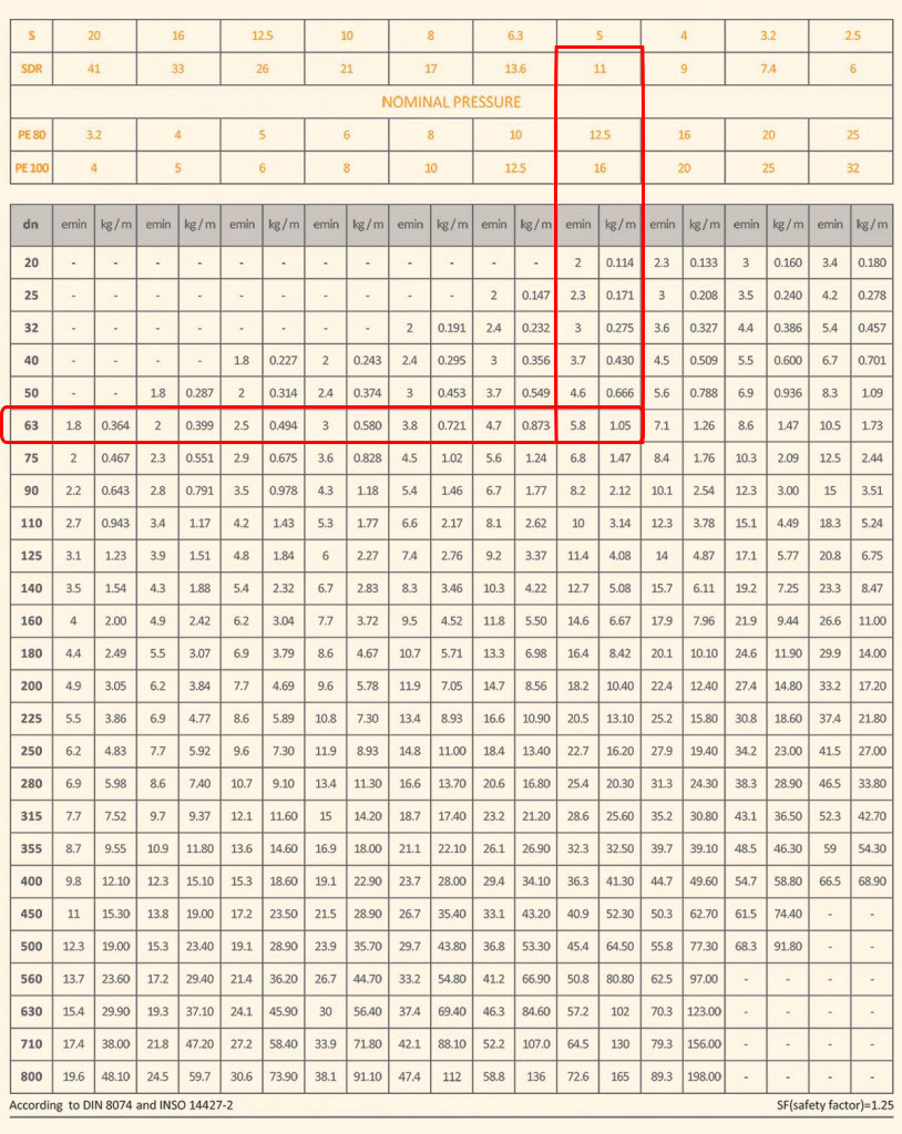 در اینجا بخاطر اینکه لوله های مصرفی ما سایز ۶۳ بوده است از جدول سازنده استفاده کرده و برای لوله های سایز ۶۳ و SDR=11 وزن لوله ها ۱.۰۵ کیلوگرم به ازای هر متر لوله می باشد بنابراین میتوانیم وزن کل لوله های مصرفی را بدست اورده و در فرمول گذاشته و تعدیل را بدست اوریم. برای نحوه ی محاسبه تعدیل کالا و چک فرمول مورد نیاز لطفا اینجا را مطالعه بفرمایید